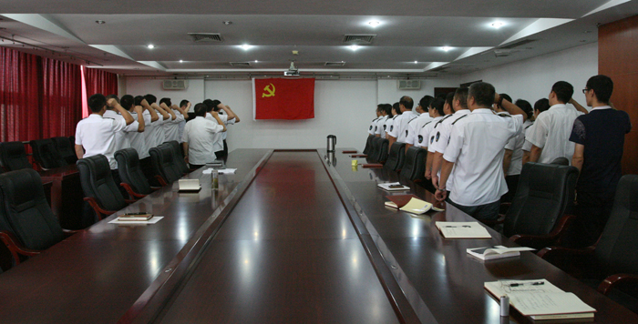 全体党员在鲜红的党旗面前列队,庄严地举起右手,在党支部书记张钦传的领誓下,铿锵有力地宣读了入党誓词,表达了对党诚挚的感情和心声。